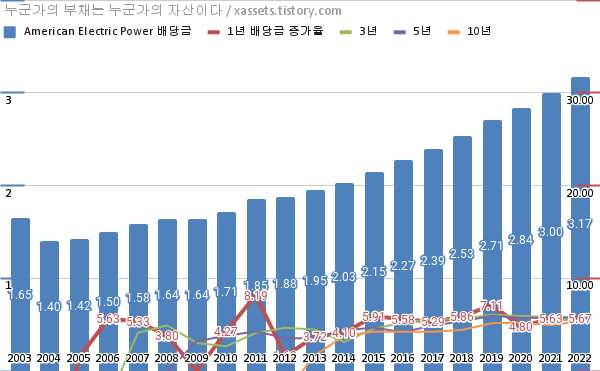 - 아메리칸 일렉트릭 파워의 2022년 기준 1, 3, 5, 10년 연평균 배당성장률은 5.67%, 5.37%, 5.81%, 5.36%이다.
