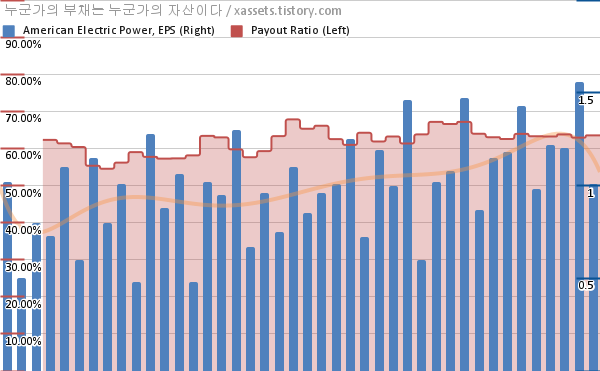 아메리칸 일렉트릭 파워 EPS 성장률, 배당성향 차트 (2012년~2022년)