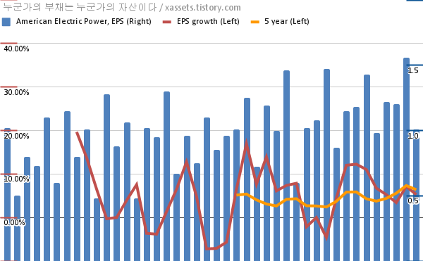 - 포스팅일 기준, 아메리칸 일렉트릭 파워의 1, 5년 연평균 EPS 성장률은 5.27%, 6.40%이다.