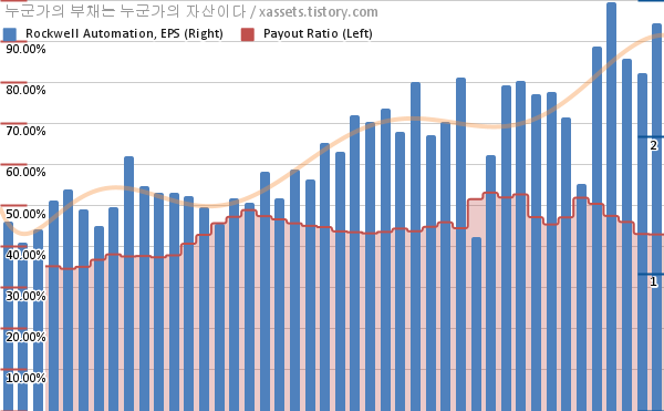 로크웰 오토메이션 EPS 성장률, 배당성향 차트 (2012년~2022년)