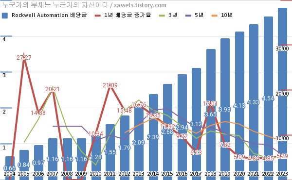 로크웰 오토메이션 배당금 및 배당성장률 차트 (2003년~2022년)