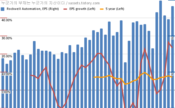 - 포스팅일 기준, 로크웰 오토메이션의 1, 5년 연평균 EPS 성장률은 7.40%, 7.24%이다.
