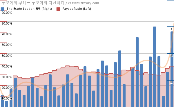 에스티 로더 EPS 성장률, 배당성향 차트 (2013년~2022년)