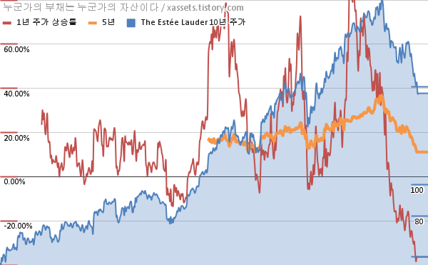 - 포스팅일 기준, 에스티 로더의 1, 3, 5, 10년 연평균 주가상승률은 -36.35%, 3.43%, 11.15%, 13.64%이다.