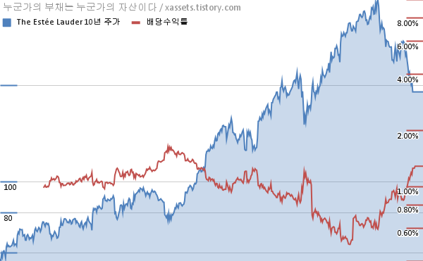 에스티 로더 배당수익률 및 주가 상승률 차트 (2012년~2022년)