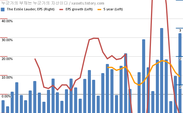 - 포스팅일 기준, 에스티 로더의 1, 5년 연평균 EPS 성장률은 -11.64%, 9.22%이다.