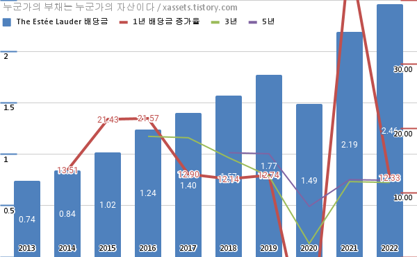 에스티 로더 배당금 및 배당성장률 차트 (2013년~2022년)