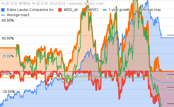 - Estee Lauder Companies Inc의 10년 평균 MDD는 -7.13%고, 52주 최저가 대비 평균 상승률은 31.06%다.
