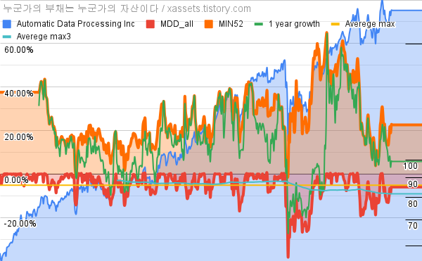- Automatic Data Processing Inc의 10년 평균 MDD는 -5.15%고, 52주 최저가 대비 평균 상승률은 25.91%다.