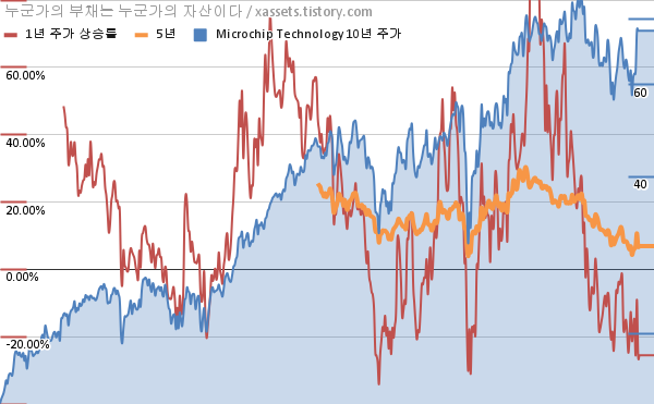 - 포스팅일 기준, 마이크로칩 테크놀로지의 1, 3, 5, 10년 연평균 주가상승률은 -9.02%, 17.04%, 10.68%, 17.59%이다.