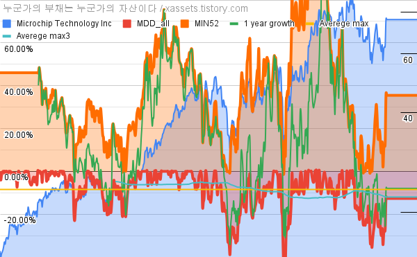 - Microchip Technology Inc의 10년 평균 MDD는 -8.45%고, 52주 최저가 대비 평균 상승률은 39.01%다.