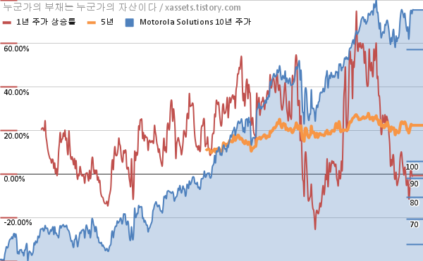 - 포스팅일 기준, 모토로라 솔루션스의 1, 3, 5, 10년 연평균 주가상승률은 -0.76%, 15.47%, 22.37%, 16.38%이다.