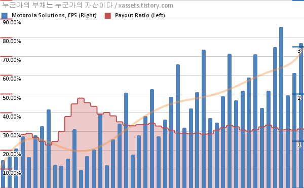모토로라 솔루션스 EPS 성장률, 배당성향 차트 (2012년~2023년)