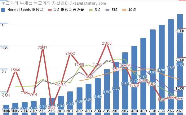 호멜 푸드 배당금 및 배당성장률 차트 (2004년~2023년)