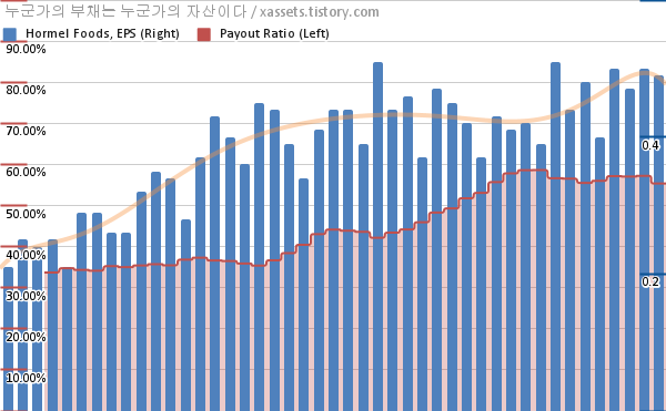 호멜 푸드 EPS 성장률, 배당성향 차트 (2012년~2023년)
