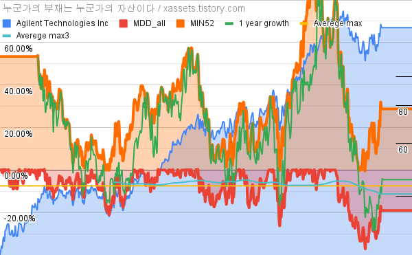 - Agilent Technologies Inc의 10년 평균 MDD는 -7.46%고, 52주 최저가 대비 평균 상승률은 29.18%다.