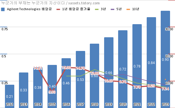 애질런트 테크놀로지스 배당금 및 배당성장률 차트 (2012년~2023년)