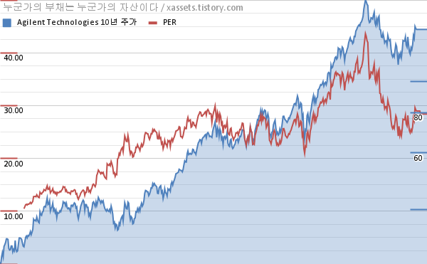 애질런트 테크놀로지스 PER 차트 (2013년~2022년)