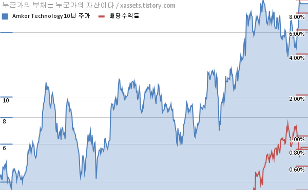 앰코 테크놀로지 배당수익률 및 주가 상승률 차트 (2012년~2022년)