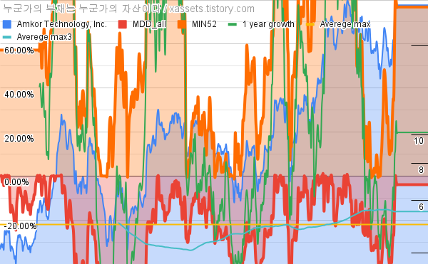 - Amkor Technology, Inc.의 10년 평균 MDD는 -22.06%고, 52주 최저가 대비 평균 상승률은 62.91%다.