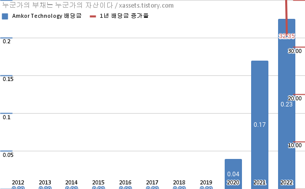 - 앰코 테크놀로지의 2022년 기준 1년 연평균 배당성장률은 32.35%이다.