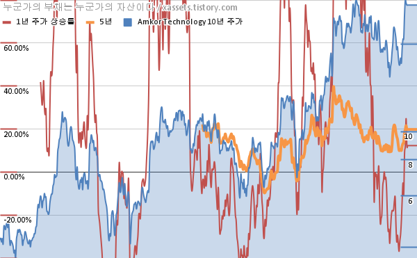 - 포스팅일 기준, 앰코 테크놀로지의 1, 3, 5, 10년 연평균 주가상승률은 24.83%, 31.91%, 21.57%, 20.53%이다.