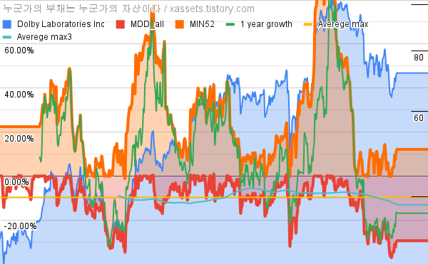 - Dolby Laboratories Inc의 10년 평균 MDD는 -9.72%고, 52주 최저가 대비 평균 상승률은 26.98%다.