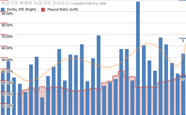 돌비 EPS 성장률, 배당성향 차트 (2014년~2022년)