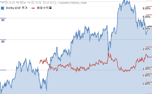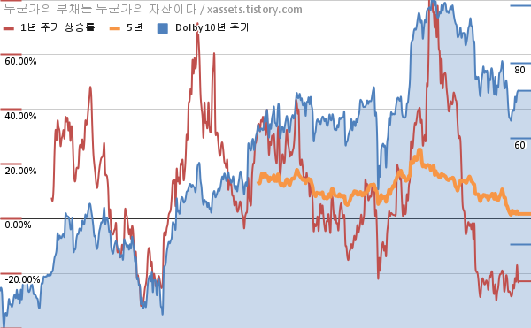 - 포스팅일 기준, 돌비의 1, 3, 5, 10년 연평균 주가상승률은 -17.00%, 1.16%, 2.83%, 7.74%이다.