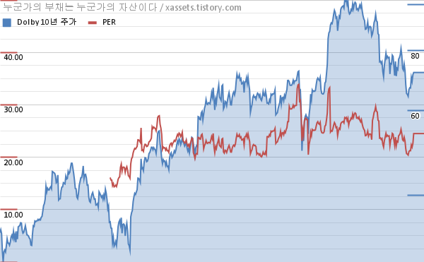 - 돌비의 PER은 살짝 높은 느낌까지 갔다가 최근엔 평균 수준으로 돌아왔다. 다만 지난 평균 수준에서는 높은 편이다.