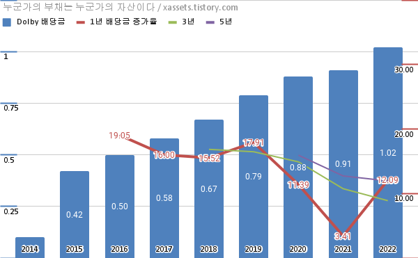 돌비 배당금 및 배당성장률 차트 (2014년~2022년)