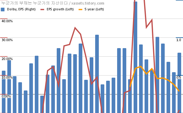 - 포스팅일 기준, 돌비의 1, 5년 연평균 EPS 성장률은 -8.41%, 1.49%이다.