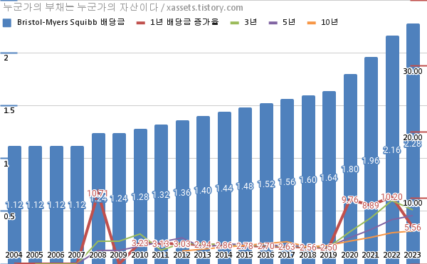 브리스톨-마이어스 스퀴브 배당금 및 배당성장률 차트 (2004년~2023년)
