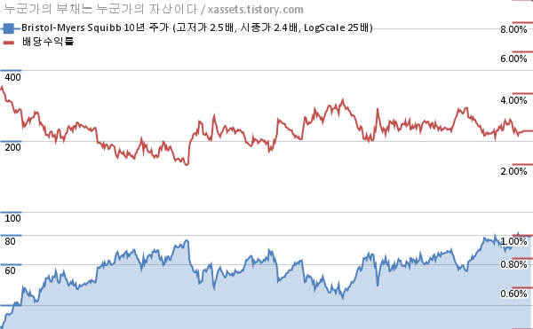 브리스톨-마이어스 스퀴브 배당수익률 및 주가 상승률 차트 (2012년~2022년)