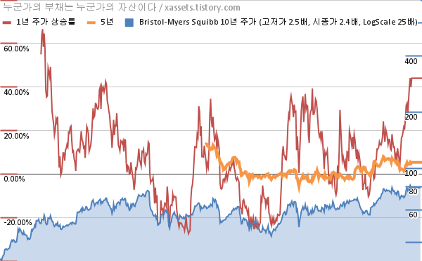 - 브리스톨-마이어스 스퀴브의 10년 평균 MDD는 -15.36%고, 52주 최저가 대비 평균 상승률은 21.83%다.