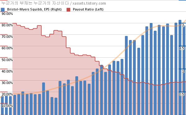 브리스톨-마이어스 스퀴브 EPS 성장률, 배당성향 차트 (2012년~2023년)