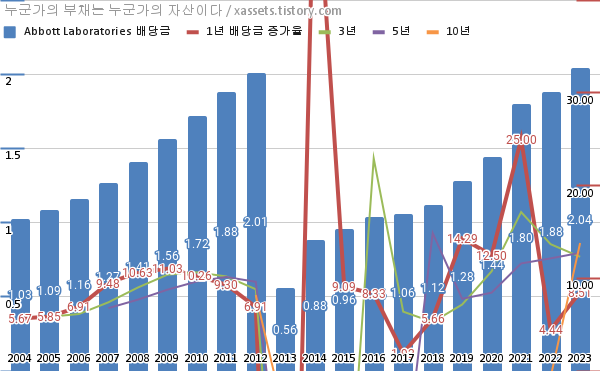 애벗 래버러토리 배당금 및 배당성장률 차트 (2004년~2023년)
