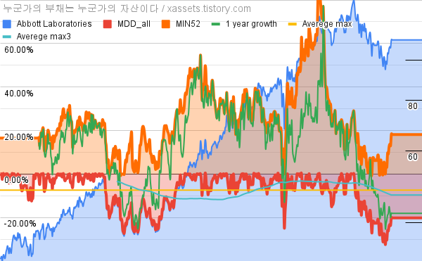 - 애벗 래버러토리의 10년 평균 MDD는 -7.41%고, 52주 최저가 대비 평균 상승률은 24.98%다.