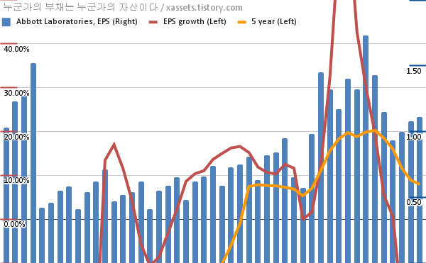 - 포스팅일 기준, 애벗 래버러토리의 1, 5년 연평균 EPS 성장률은 -26.82%, 7.95%이다.