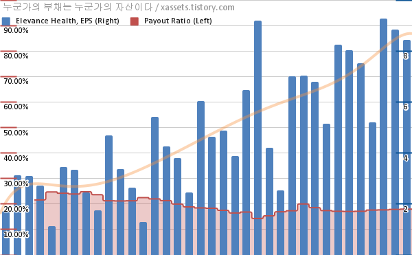 엘레반스 헬스 EPS 성장률, 배당성향 차트 (2014년~2023년)
