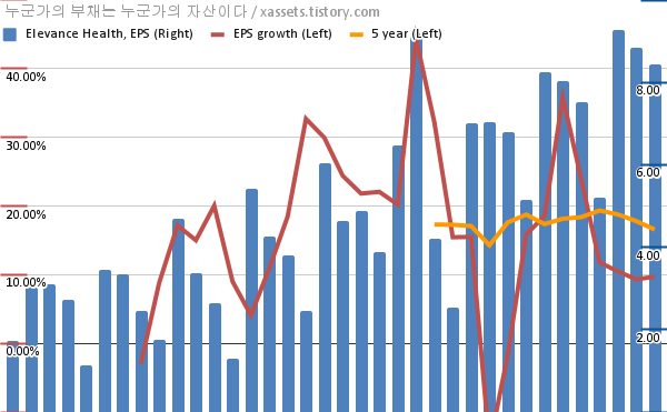 - 포스팅일 기준, 엘레반스 헬스의 1, 5년 연평균 EPS 성장률은 9.70%, 16.57%이다.