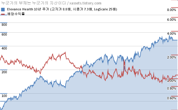 엘레반스 헬스 배당수익률 및 주가 상승률 차트 (2013년~2023년)