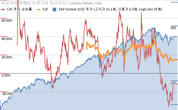 - S&P 글로벌의 10년 평균 MDD는 -6.75%고, 52주 최저가 대비 평균 상승률은 37.15%다.