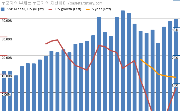 - 포스팅일 기준, S&P 글로벌의 1, 5년 연평균 EPS 성장률은 2.38%, 8.21%이다.