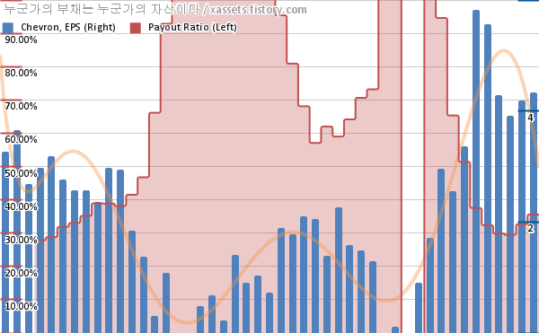 셰브런 EPS 성장률, 배당성향 차트 (2012년~2023년)