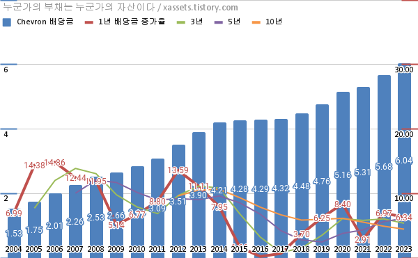 셰브런 배당금 및 배당성장률 차트 (2004년~2023년)
