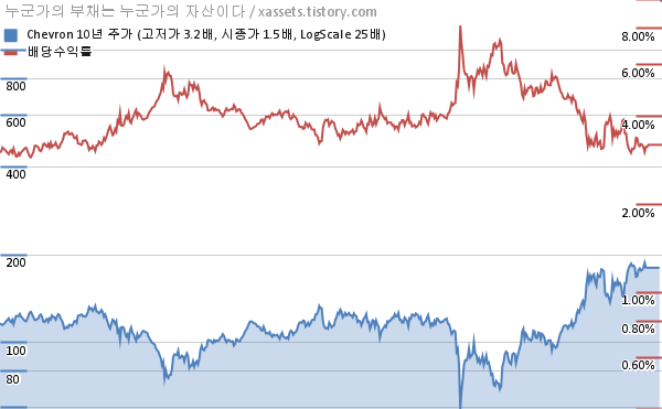 - 포스팅일 기준, 셰브런의 1, 3, 5, 10년 연평균 주가상승률은 43.78%, 20.57%, 9.63%, 4.97%이다.