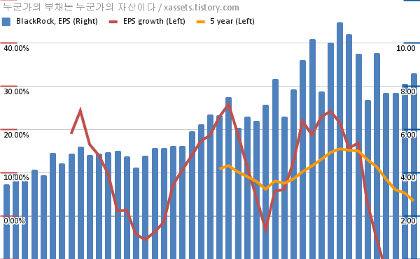 - 포스팅일 기준, 블랙록의 1, 5년 연평균 EPS 성장률은 -12.86%, 3.44%이다.