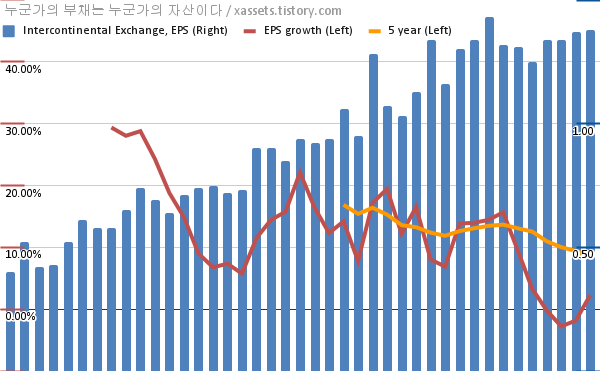 - 포스팅일 기준, 인터컨티넨털 익스체인지의 1, 5년 연평균 EPS 성장률은 2.26%, 8.63%이다.