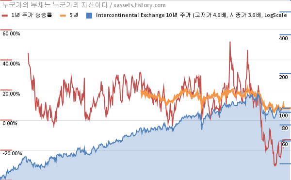 - 포스팅일 기준, 인터컨티넨털 익스체인지의 1, 3, 5, 10년 연평균 주가상승률은 -16.52%, 5.36%, 9.62%, 13.22%이다.